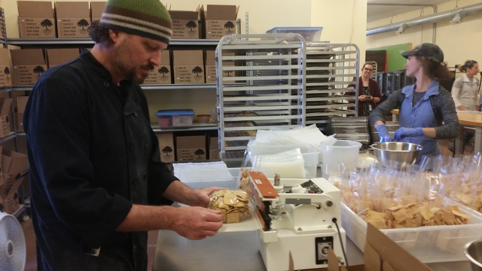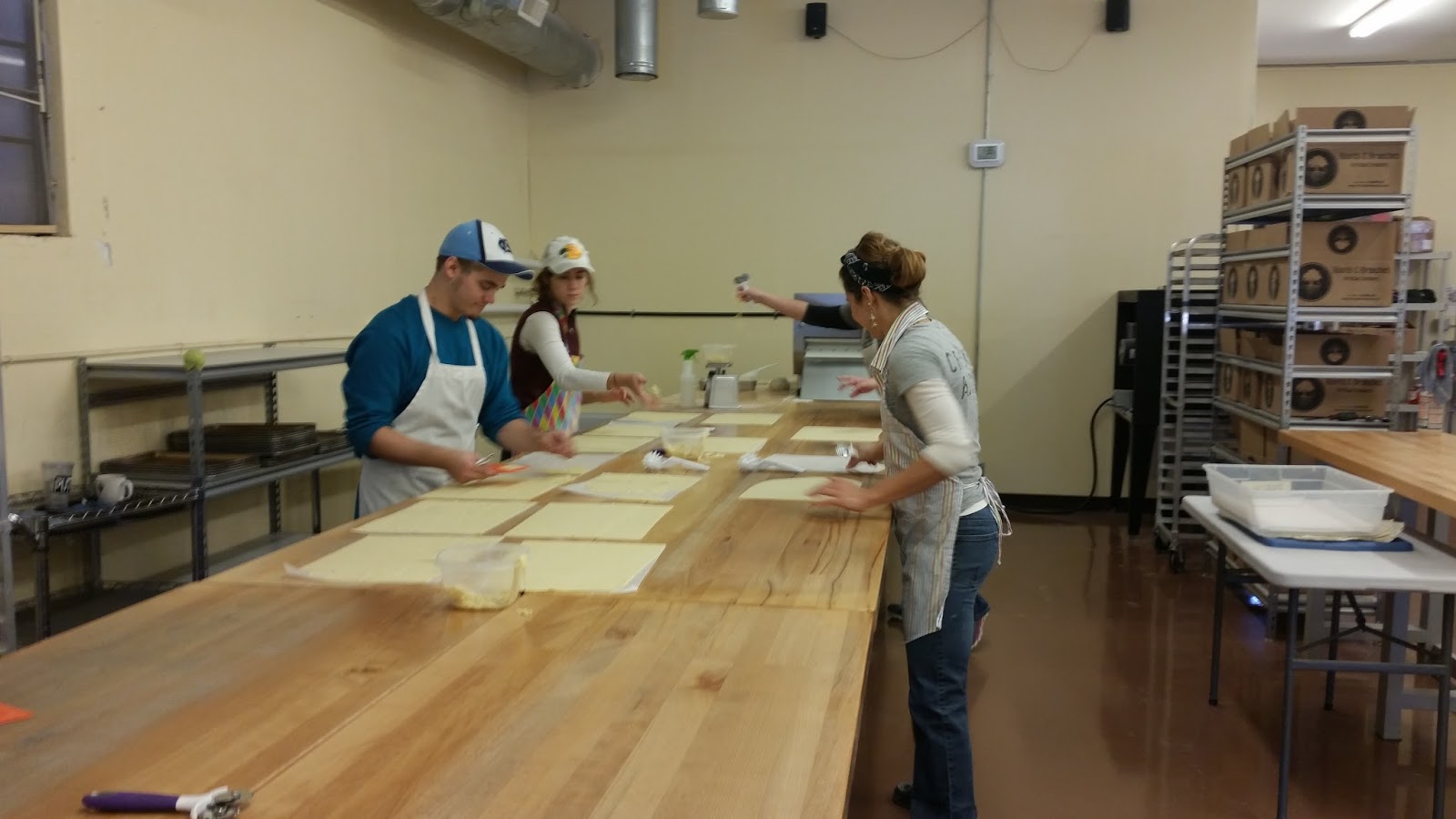Ana Mitchell (“Cracker Addict”) and Roots and Branches employees cutting the dough for crackers